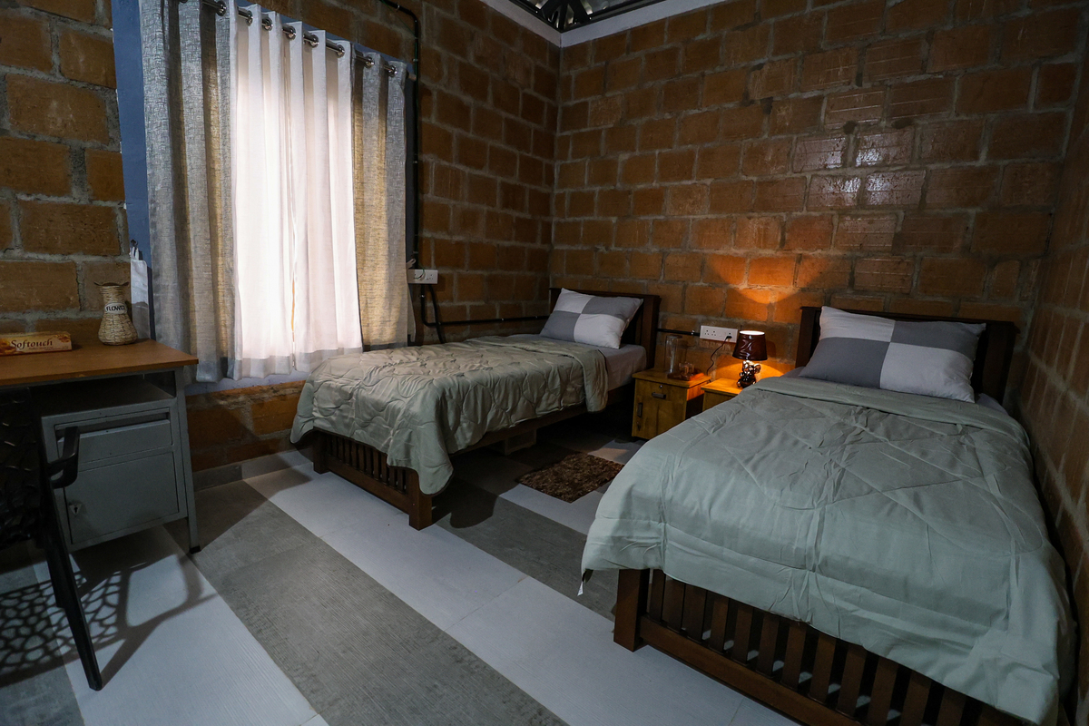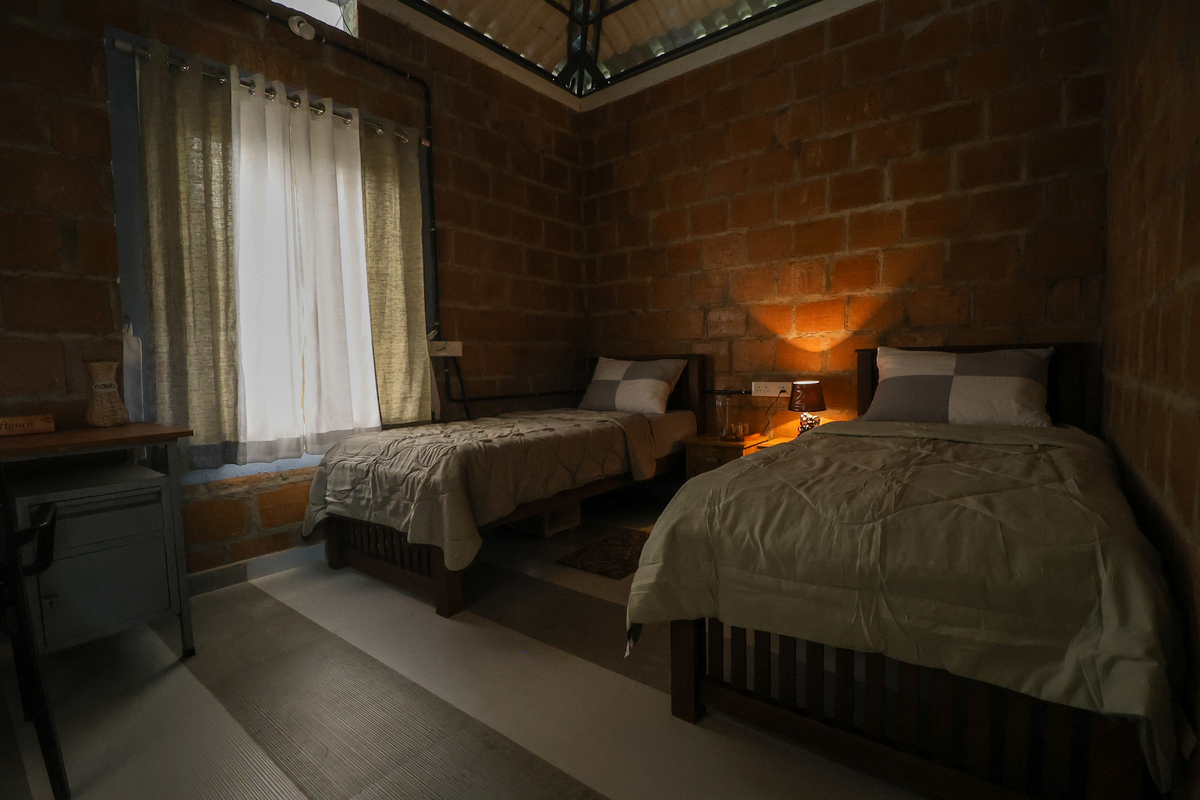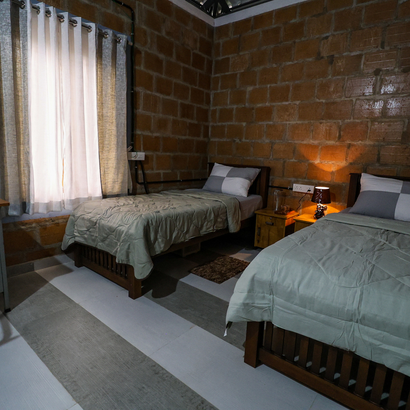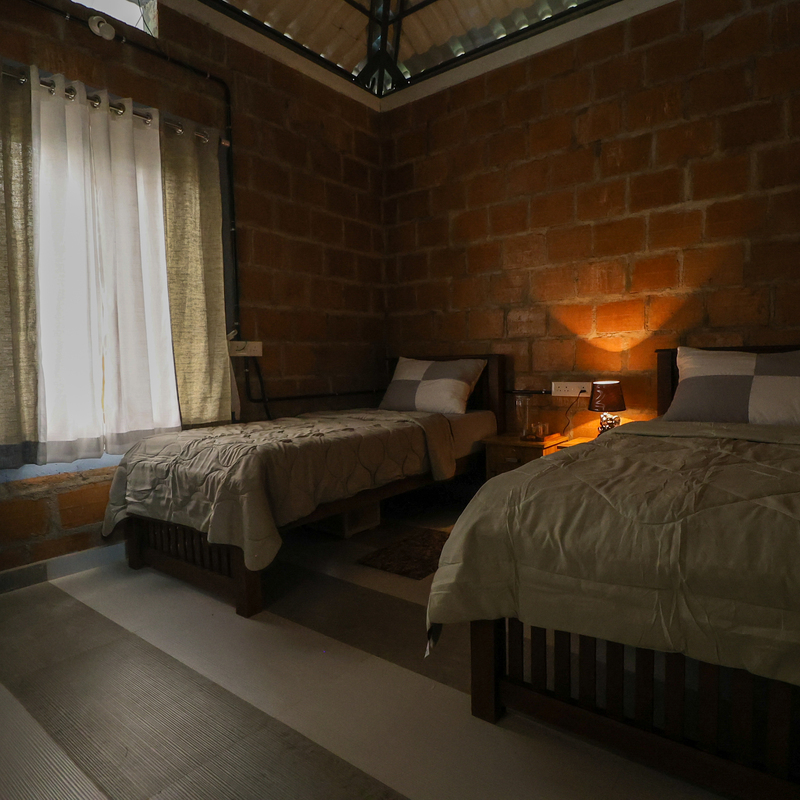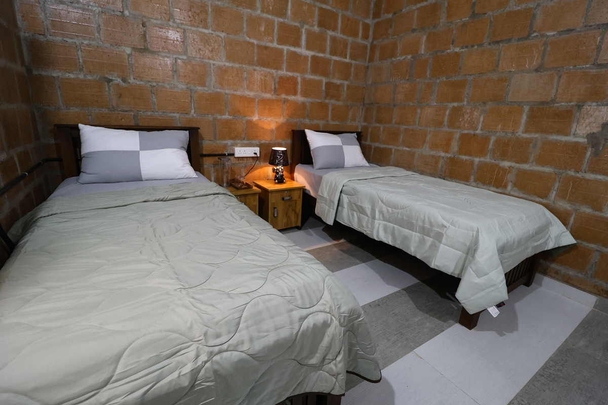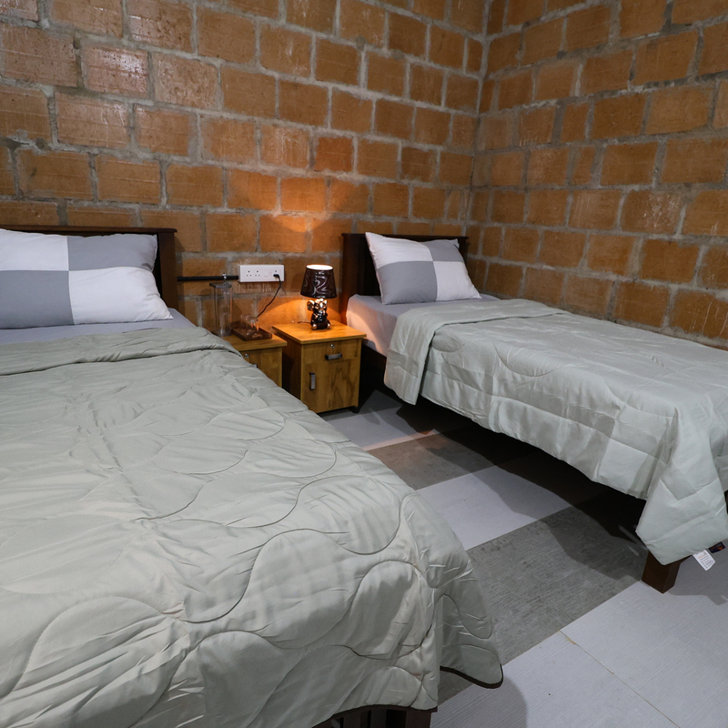 This configuration transforms into our spacious Family Suite, where the combined twin and double bed spaces offer ample comfort and privacy for the entire group. Built with insulating mud brick to guarantee a naturally cooler temperature, this room goes beyond typical amenities, featuring a convenient double-door refrigerator, washing machine, and cooking stove, complemented by a high-quality water purifier. Your comfort and safety are paramount, with essential, yet discreet, facilities like a fire extinguisher and first aid box readily available, all backed by the warmth of our genuine local hospitality.